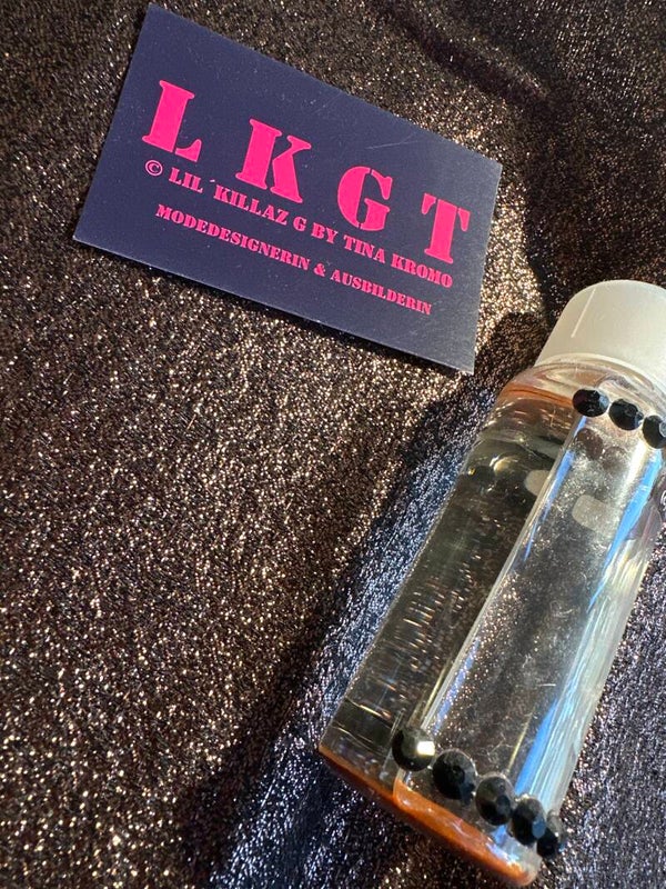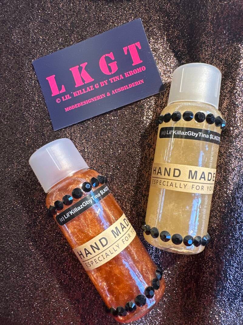 Zugabe von Lebensmittelfarbe, daher sind die glitzernden Partikel nicht schädlich für die Haut!